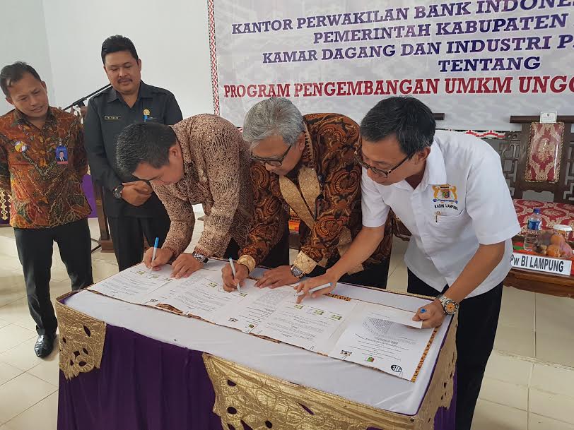 gerbangrepublik.com – Pemerintah Kabupaten Pesawaran melakukan penandatanganan kesepakatan kerjasama dengan perwakilan Bank Indonesia ( BI ) Provinsi Lampung serta Kamar Dagang Indonesia ( kadin ) tentang pengembangan Usaha Mikro Kridit Menengah ( UMKM ) unggulan Tapis Pesawaran .