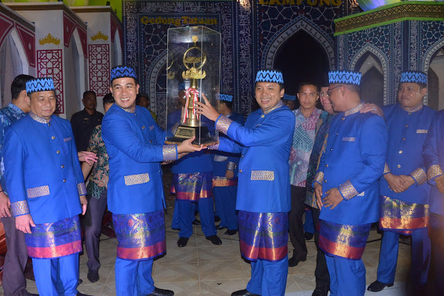 | Gubernur Lampung M.Ridho Ficardo saat menyerahkan Piala bergilir MTQ Ke 45 Tingkat Provinsi Lampung kepada Bupati Pesawaran Dendi Romadhona di Islamic Centre Jumat (21/4/2017) |