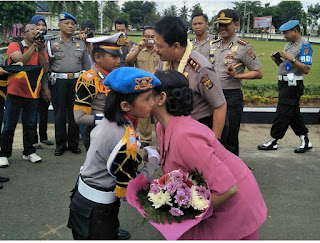 Dua personil Polisi Cilik ikut menyambut Kapolda dan Ibu Novie dengan pengalungan bunga dan di lanjutkan dengan persembahan Tari Sigeh Peng uten dari personil Polwan Polres Lampung Timur kemudian Kapolda menerima jajar hormat dan menyapa hangat para personil Polres yang dikenalkan langsung oleh AKBP Yudi Chandra Erlianto.
