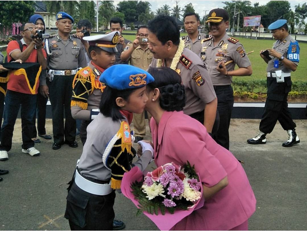 Dua personil Polisi Cilik ikut menyambut Kapolda dan Ibu Novie dengan pengalungan bunga dan di lanjutkan dengan persembahan Tari Sigeh Peng uten dari personil Polwan Polres Lampung Timur kemudian Kapolda menerima jajar hormat dan menyapa hangat para personil Polres yang dikenalkan langsung oleh AKBP Yudi Chandra Erlianto.