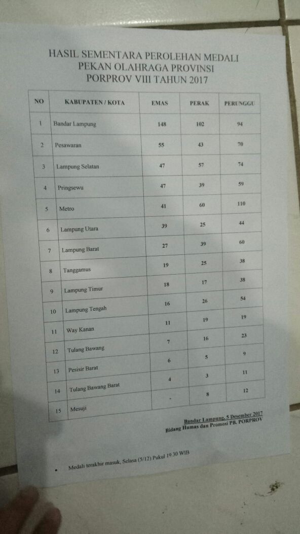 Berikut hasil akhir perhitungan medali yang di leroleh masing masing atlit pekan olahraga Provinsi Lampung .(red)