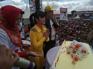Ya. Dewi Perssik yang menjadi artis utama kali ini merayakan hari ulang tahun yang ke-32. Kue tar berukuran besar yang dominan warna kuning bergaris putih dikelilingi lilin kecil dihiasi berbagai bunga di tengahnya langsung dipajang di panggung utama oleh panitia kegiatan.