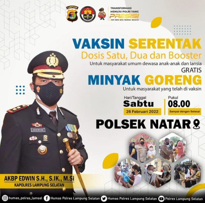 lampungmedia.co, Lampung Selatan – Berangkat dari kasus Covid-19 yang semakin hari semakin melonjak di Lampung, dikutip langsung pada Instagram resmi Humas Polres Lampung Selatan (@humas_polres_lamsel) pada Jum’at (25/02/2022) akan diadakan vaksinasi dosis satu, dua, dan booster untuk masyarakat umum dewasa, anak-anak, serta lansia secara serentak dan gratis.