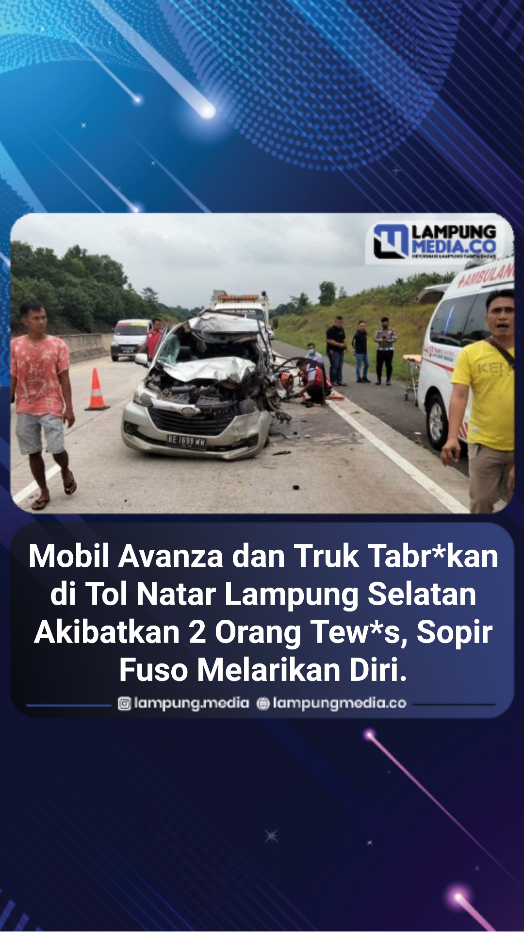 lampungmedia.co, Lampung Selatan – Kecelakaan antara Toyota Avanza BE 1699 WW dengan Truk Fuso Tanpa identitas terjdi di Jalan Tol Trans Sumatera (JTTS) Km 102+200 Ruas, Rulung Helok, Natar, Lampung Selatan, Selasa (26/7/2022).