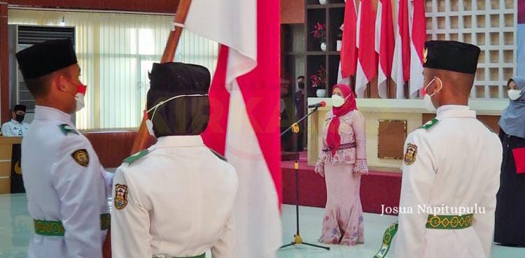 Pengukuhan Pasukan Pengibar Duplikat Bendera Pusaka (Paskibraka) dihadiri Forkopimda setempat, orangtua/wali siswa, dan kepala OPD.