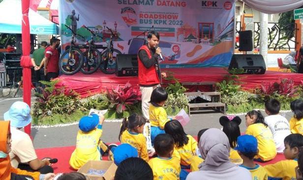 Nilai antikorupsi seperti jujur, peduli, mandiri dan disiplin disampaikan melalui dongeng kepada para anak paud dan TK yang sedang berada di Taman UMKM Bung Karno.