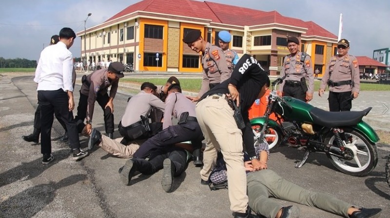Pelaku langsung diborgol dan dibawa ke ruang pemeriksaan guna menjalani proses penyidikan. Aksi tersebut menjadi skenario dalam simulasi sistem pengamanan Mapolres.