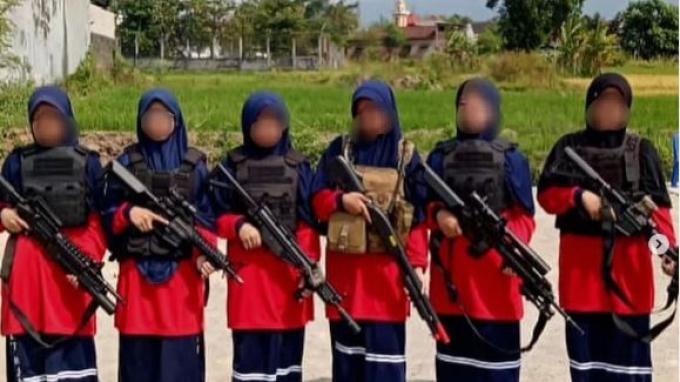 lampungmedia.co, Magetan – Beredar foto sebanyak 6 santriwati berpose memegang senjata airsoft gun. Terdapat dua foto yang memperlihatkan santriwati itu berbaris dengan menenteng senjata.