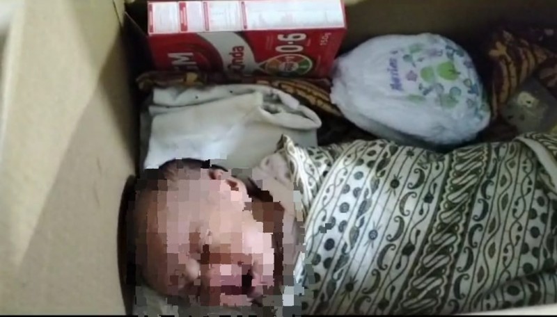 Bayi yang diperkirakan baru berumur satu minggu itu diselimuti kain warna putih abu-abu. Serta terdapat popok bayi dan susu di dalam kardus.