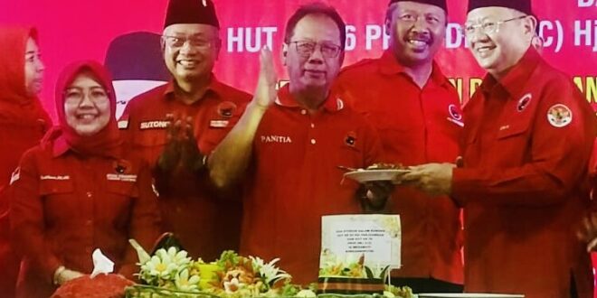 Dalam peringatan HUT, terlihat Ketua DPD PDI Perjuangan Lampung Sudin memberikan potongan tumpeng kepada mingrum gumay dengan tangan terlihat menggunakan salam Pancasila pada saat momen perayaan tersebut.