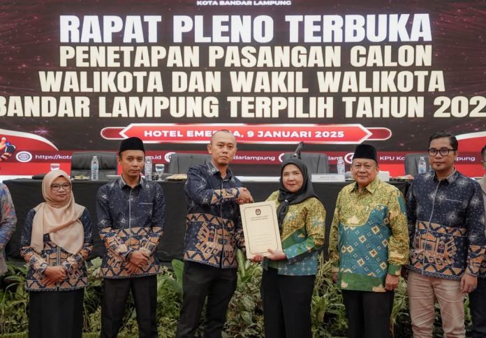 lampungmedia.id, Bandar Lampung – Komisi Pemilihan Umum (KPU) Kota Bandar Lampung secara resmi menetapkan pasangan Hj. Eva Dwiana dan Deddy Amarullah sebagai Wali Kota dan Wakil Wali Kota Bandar Lampung terpilih untuk masa bakti 2025–2030. Penetapan ini dilakukan dalam Rapat Pleno Terbuka yang berlangsung di Ballroom Emersia Hotel, Jalan Wolter Monginsidi, Kota Bandar Lampung.