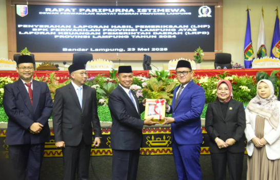 lampungmedia.id, Bandar Lampung – Dewan Perwakilan Rakyat Daerah (DPRD) Provinsi Lampung menggelar Rapat Paripurna Istimewa di Ruang Rapat Paripurna DPRD. Acara ini dipimpin oleh Ketua DPRD, Ahmad Giri Akbar, S.E., M.B.A., dalam rangka penyerahan Laporan Hasil Pemeriksaan (LHP) oleh BPK Perwakilan Provinsi Lampung atas Laporan Keuangan Pemerintah Daerah (LKPD) Tahun Anggaran 2024.