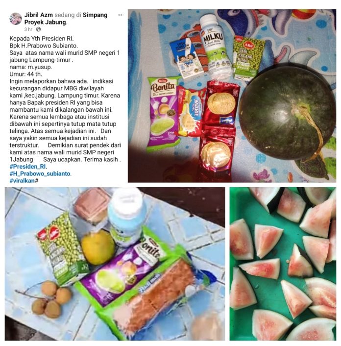Lampung Timur — Dugaan kecurangan dalam pengelolaan dapur MBG di Kecamatan Jabung, Kabupaten Lampung Timur, kian menguat. Seorang wali murid SMP Negeri 1 Jabung, M. Yusup (44), mengungkapkan bahwa nilai makanan yang diterima siswa diduga jauh dari standar kewajaran, bahkan disebut tidak mencapai Rp20 ribu dalam satu pekan.