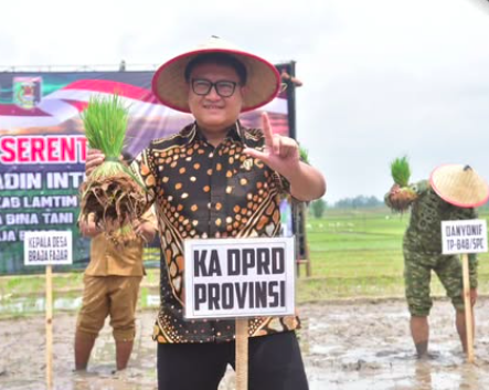 Bandar Lampung— Ketua DPRD Provinsi Lampung, A. Giri Akbar, S.E., M.B.A., menghadiri kegiatan Tanam Padi Bersama Forum Koordinasi Pimpinan Daerah (Forkopimda) yang dilaksanakan pada Selasa, 20 Januari 2026, di Desa Braja Fajar, Kecamatan Way Jepara, Kabupaten Lampung Timur, wilayah teritorial Kodim 0429/Lampung Timur.