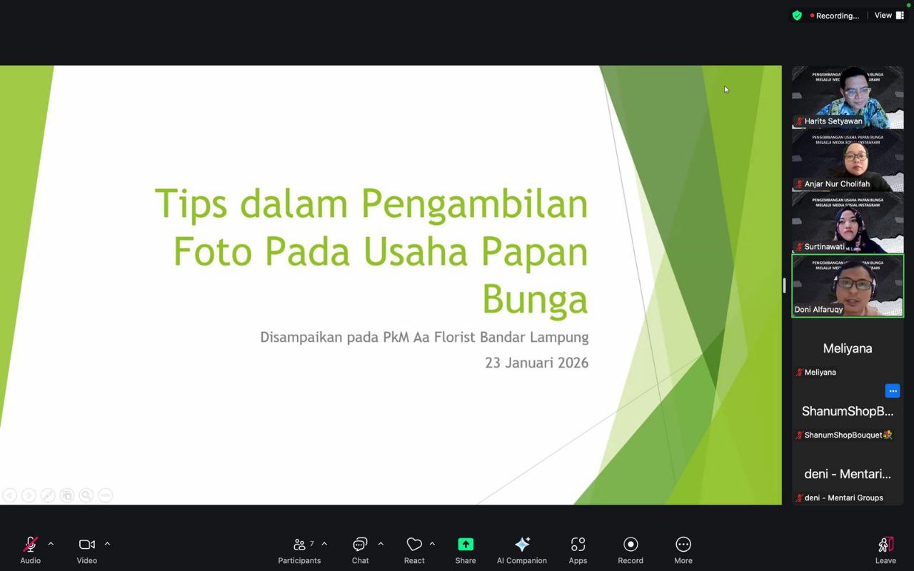 Bandar Lampung  – Dosen Institut Teknologi Sumatera (Itera) yang terdiri dari Harits Setyawan, S.Pd., M.Pd. (Program Studi Desain Komunikasi Visual), Doni Alfaruqy, M.Pd. (Program Studi Pariwisata), Anjar Nur Cholifah, M.Pd. (Program Studi Desain Komunikasi Visual), Dr. Sunarsih, S.S., M.A. (Program Studi Desain Komunikasi Visual), serta Hafiz Dwi Firmansyah, S.Kom., M.Sc., Ph.D (Program Studi Teknik Informatika) melaksanakan kegiatan Pengabdian kepada Masyarakat (PKM) pada Minggu, 24 Januari 2026 secara daring melalui aplikasi Zoom