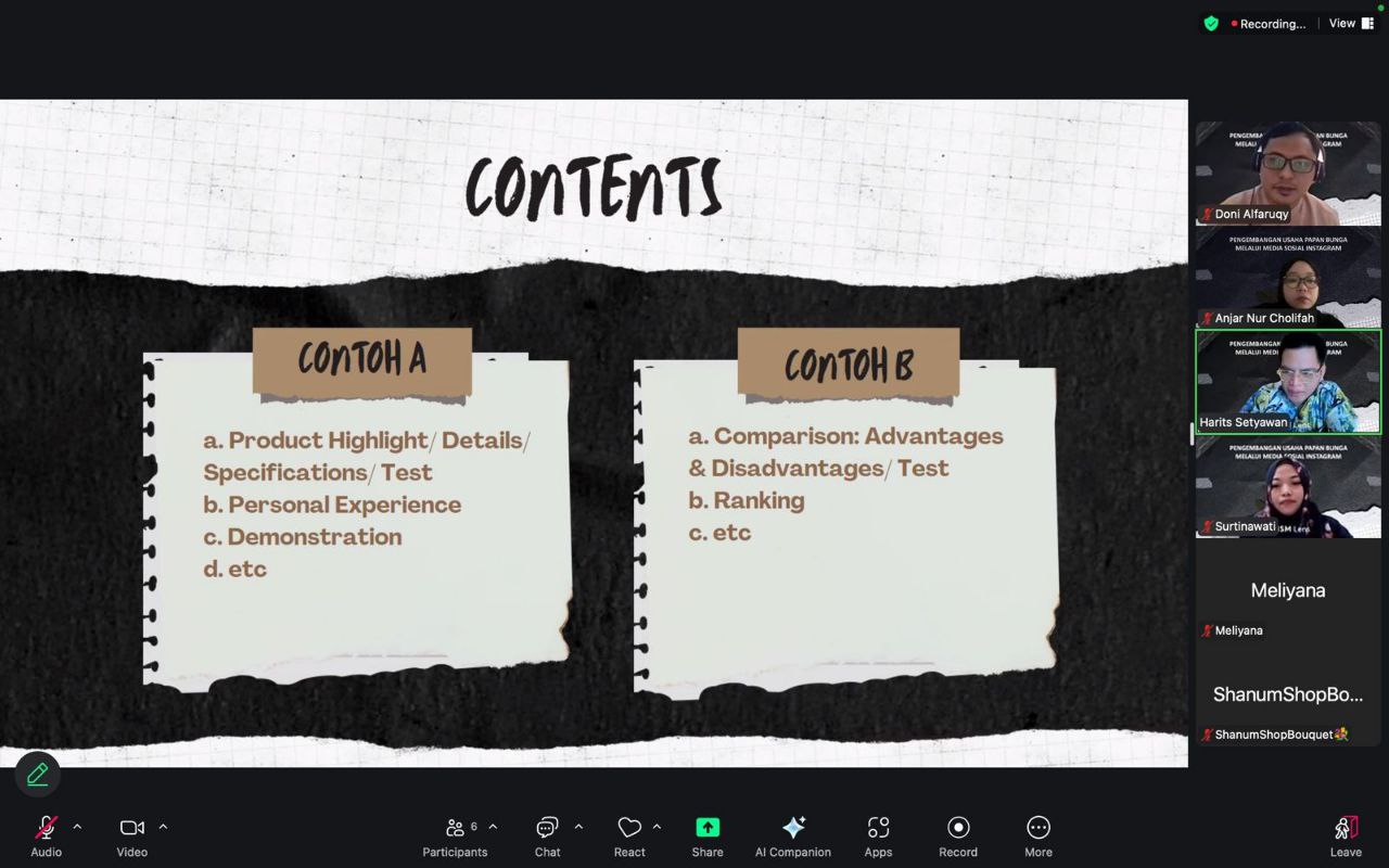 Kegiatan ini dihadiri oleh peningkatan kemampuan pelaku usaha dalam memanfaatkan media sosial sebagai sarana promosi produk. Pada kegiatan tersebut, Harits Setyawan, S.Pd., M.Pd. menyampaikan materi utama tentang pembuatan video promosi untuk media sosial, khususnya Instagram.